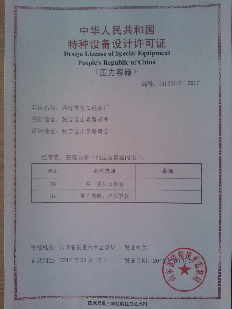 淄博市化工设备厂设计许可证