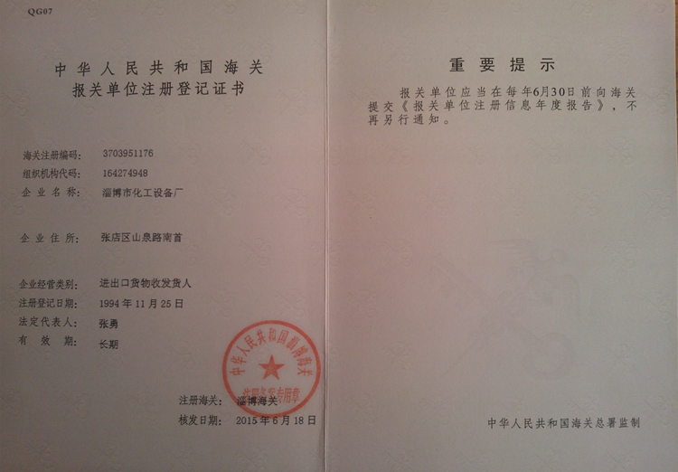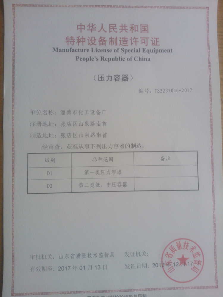 淄博市化工设备厂制造许可证